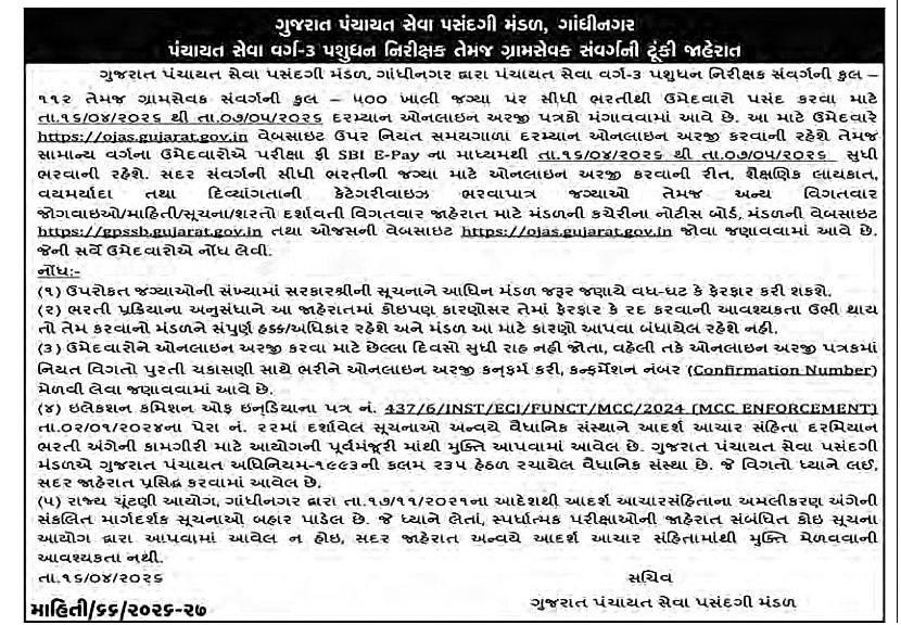 - The recruitment process is conducted under the provisions of the Gujarat Panchayat Act, 1993, and in compliance with the Model Code of Conduct (MCC).