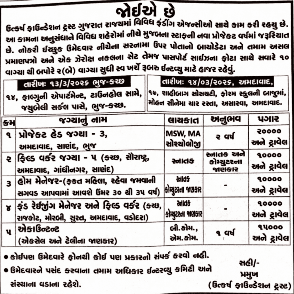 Utkarsh Foundation Trust is working with various funding agencies in Gujarat State. In connection with this work, there is a requirement for staff in various cities for new project years. Interested candidates should remain present for a walk-in interview at their own expense with their biodata, all original certificates, one set of photocopies, and passport-size photographs between 10:00 AM and 02:00 PM at the addresses given below.